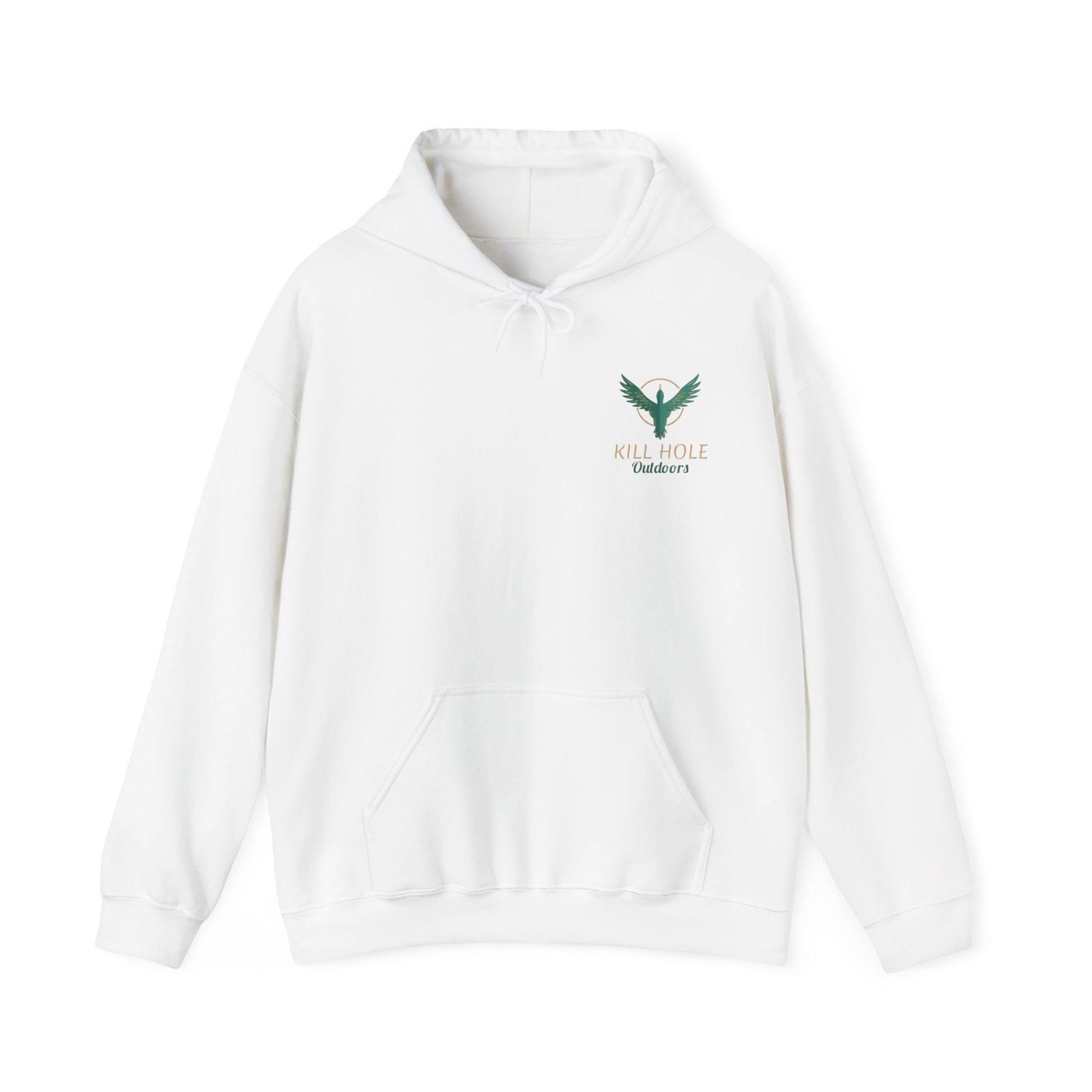 Smoking Green duck hunting hoodie by Kill Hole Outdoors. This unisex heavy blend hooded sweatshirt is relaxation itself. Made with a thick blend of cotton and polyester, it feels plush, soft and warm, a perfect choice for any cold day. In the front, the spacious kangaroo pocket adds daily practicality while the hood's drawstring is the same color as the base sweater for extra style points.